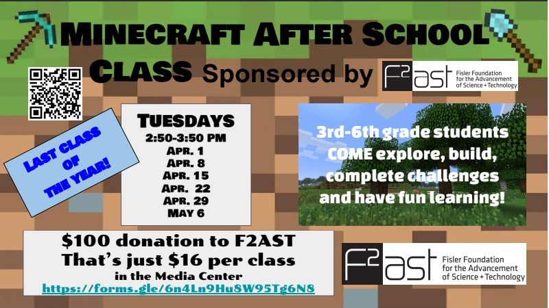 Spring 2025 Minecraft is here! Come have a blast in Mrs. Bass last session of the year! This session is ONLY on Tuesdays, session times: